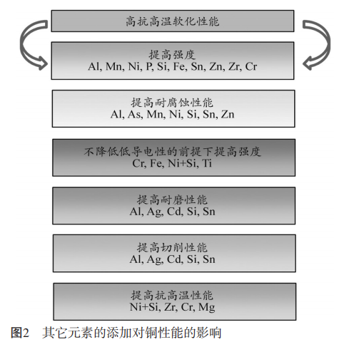 铜易与其它元素形成铜合金,进而可以通过合金化的方式提高铜的各项性能,以满足汽车连接器用铜合金带的性能要求,如图2所示。