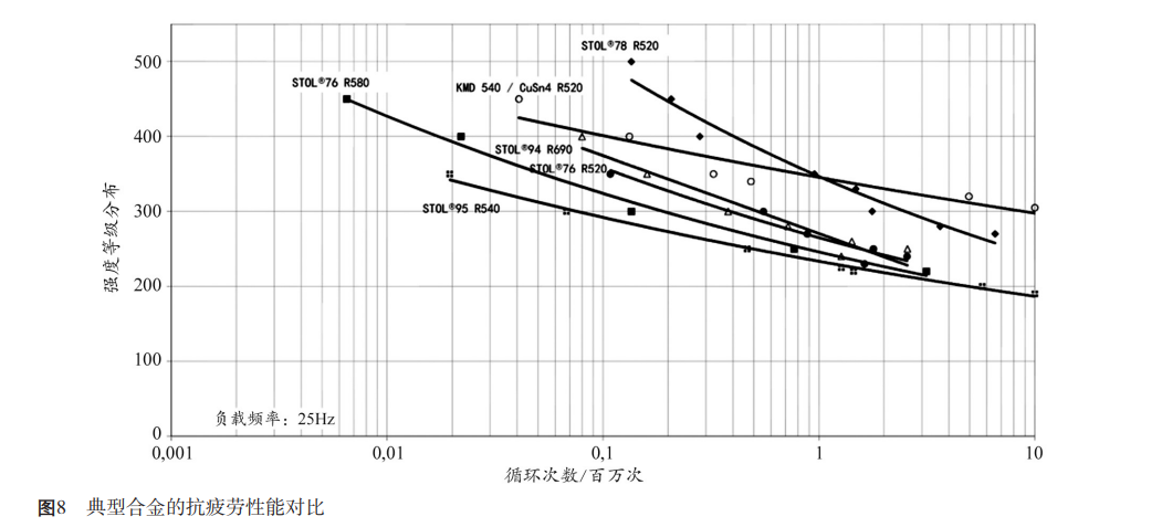 本文中列举了几个典型铜及铜合金带在不同的弯曲次数下的疲劳极限强度,如图8所示。