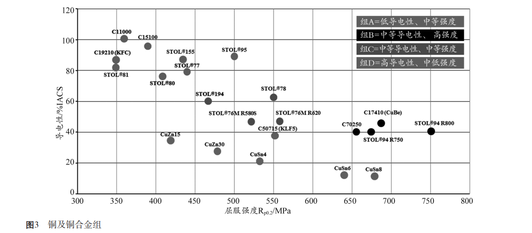如图3所示的,中等强度、高导电性的STOL@95,中等强度、中等导电性的STOL@76M,高强度、中等导电性的STOL@94,中等强度、低导电性的CuSn8。