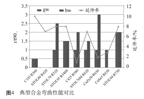 由图 4 可知,虽然 C103 和 STOL80 的弯曲性 能比其它合金优异,但是强度却低。而STOL76M、 STOL78、STOL95 和 CuSn5 不仅强度高,弯曲性能 也优良,符合汽车连接器用铜及铜合金带对弯曲性能的要求。