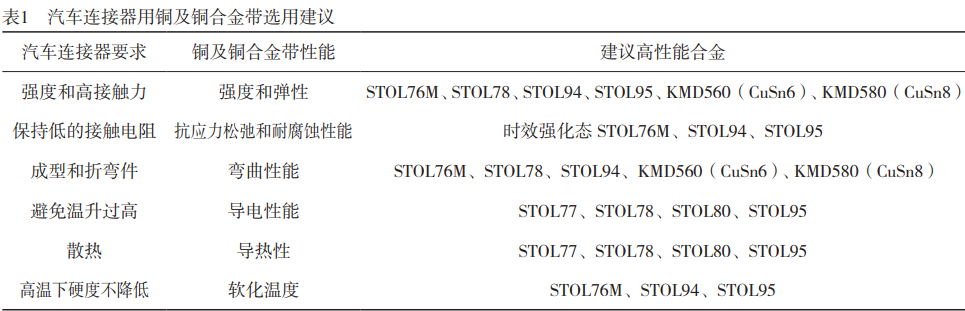 本文根据汽车连接器对铜及铜合金铜带性能要求,建议了适合汽车连接器各项性能要求的高性能铜合金,如表 1 所示。