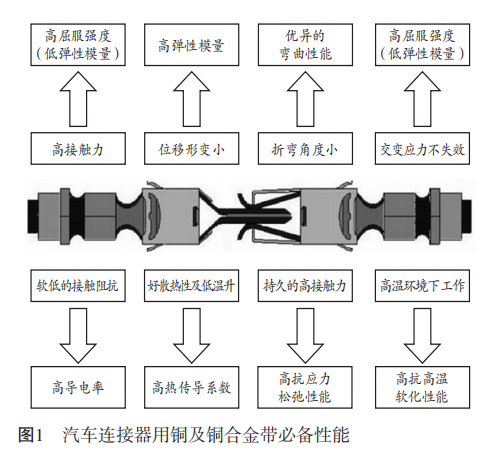 汽车连接器所需的性能包括高接触力、位移形变小(下压行程有限但需高接触力)、折弯角度小(产品微型化)、交变应力不失效(高插拔次数)、较低的接触阻抗、好散热性及低温升、持久的高接触力/高温环境下工作、符合环保标准。因此,这就要求铜及铜合金带必须具备高屈服强度、高弹性模量、高导电率、优异的弯曲性能(低r/t)、优异的抗疲劳性能、高热传导系数、高抗应力松弛/抗高温软化性能、无环境有害物质 /ROHS 等性能,如图1所示。