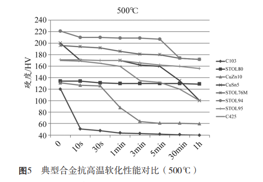 本文中列举了几个典型铜及铜合金带在 500℃ 下的抗高温软化性能,如图 5 所示。